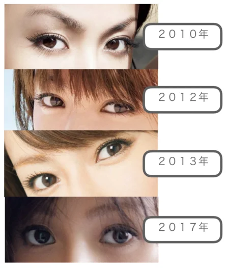 目元の印象は眉バランスやメイクによって変わっているものの、目頭と目尻のバランスはそこまで大きく変わっていないのかな?と感じました。