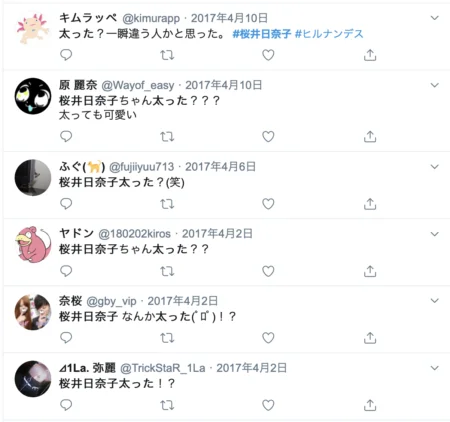 最近の桜井日奈子さんを目にした人たちからは「太った?」「顔丸くなった?」と言った声が多数見られます。