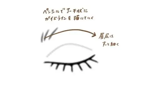 最初に、アイブロウペンシルを使い、眉頭の中間辺りから眉尻に向かって、真っ直ぐ(気持ちアーチ状に)眉のアウトラインを描いていきます。